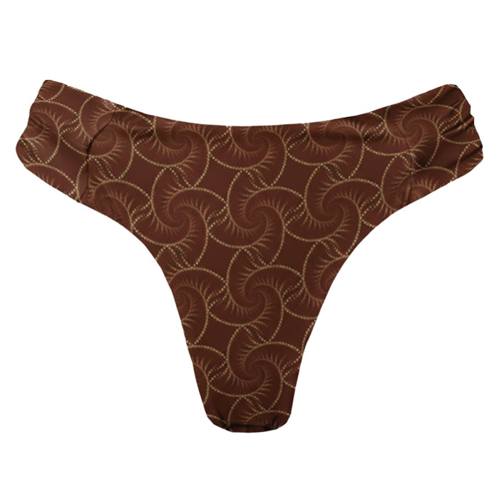 Calcinha de Biquíni Borboleta Fio Duplo Conchas Marrom desenvolvida em tecido de tecnologia LYCRA®, com proteção solar UVA e UVB +50. Peça com estampa exclusiva da Coleção Verão Marétoa, com fino acabamento e costura invisível nas laterais das pernas, garantindo maior conforto durante o uso.
