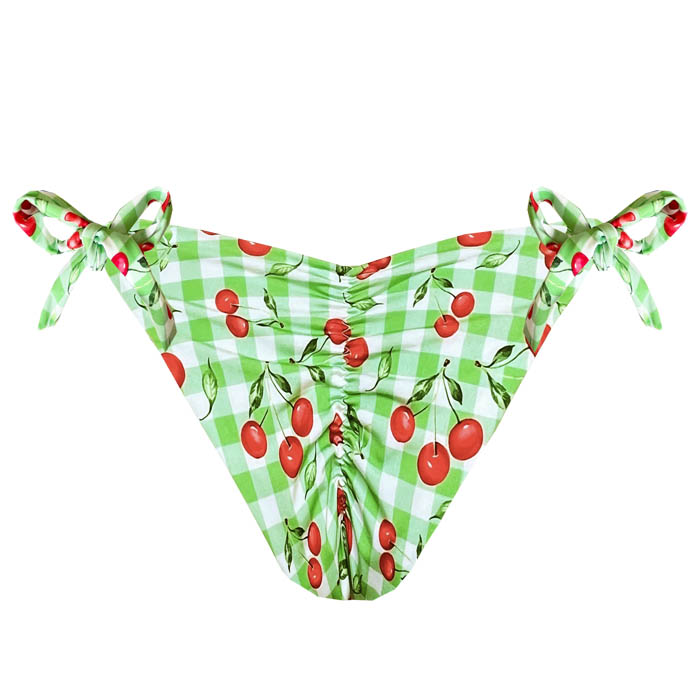 Calcinha de Biquíni Empina Bumbum Cereja Xadrez Verde desenvolvida em tecido de tecnologia LYCRA®, com proteção solar UVA e UVB +50. Peça com estampa exclusiva da Coleção Verão Marétoa, com fino acabamento e costura invisível nas laterais das pernas, garantindo maior conforto durante o uso.