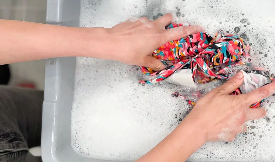 Sempre que sair da praia ou piscina enxágue o biquíni em água corrente fria imediatamente. Isso remove resíduos de sal, cloro, areia e protetor solar que podem danificar o tecido. Se possível, lave com sabão neutro logo após o uso.