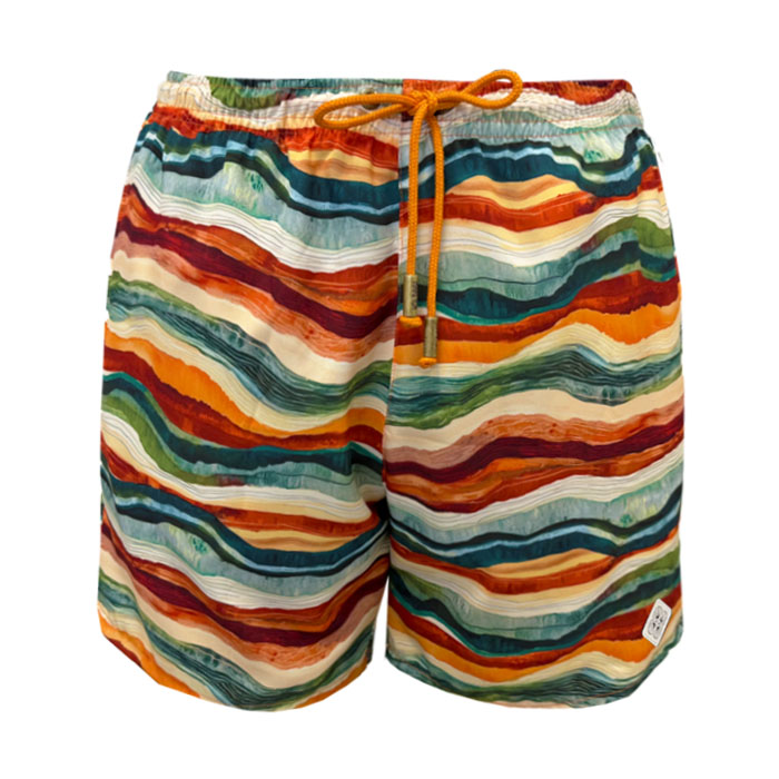 Shorts Bermuda Masculina de Praia Dunas Colorido desenvolvido em poliéster de alta qualidade. Peça com estampa exclusiva da Coleção Marétoa. Possui corda na cintura para amarração, detalhe em termocolante e regulagem com ponteiras douradas.