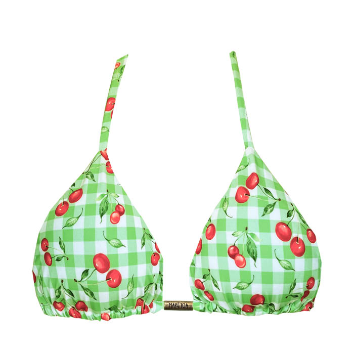 Top de Biquíni Cortininha Cereja Xadrez Verde com bojo removível e maleável que não quebra e não absorve água, desenvolvido em tecido de tecnologia LYCRA®, com proteção solar UVA e UVB +50. Peça com estampa exclusiva da Coleção Verão Marétoa, com fino acabamento, costura invisível e forro em poliamida trazendo maior conforto à pele.