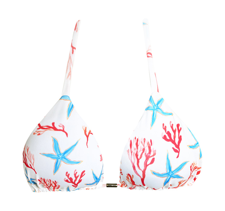 Top de Biquíni Cortininha Estrela do Mar Branco com bojo removível e maleável que não quebra e não absorve água, desenvolvido em tecido de tecnologia LYCRA®, com proteção solar UVA e UVB +50. Peça com estampa exclusiva da Coleção Verão Marétoa, com fino acabamento, costura invisível e forro em poliamida trazendo maior conforto à pele. Veja a coleção completa de estampas aqui.